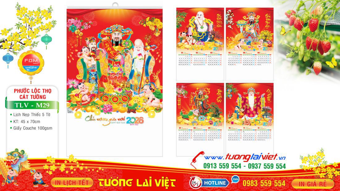 Lịch 5 tờ nẹp thiếc thường được in Offset 1 mặt trên giấy C105gsm, có kích thước: 36×70 và 45x70cm. Lịch 5 tờ Phúc lộc thọ là mẫu lịch tờ treo tường giá rẻ nên được nhiều cửa hàng nhỏ lẻ chọn in lịch tết năm nay để làm quà tặng cuối năm cho khách hàng, bạn bè, đối tác và người thân nhân dịp năm mới.
